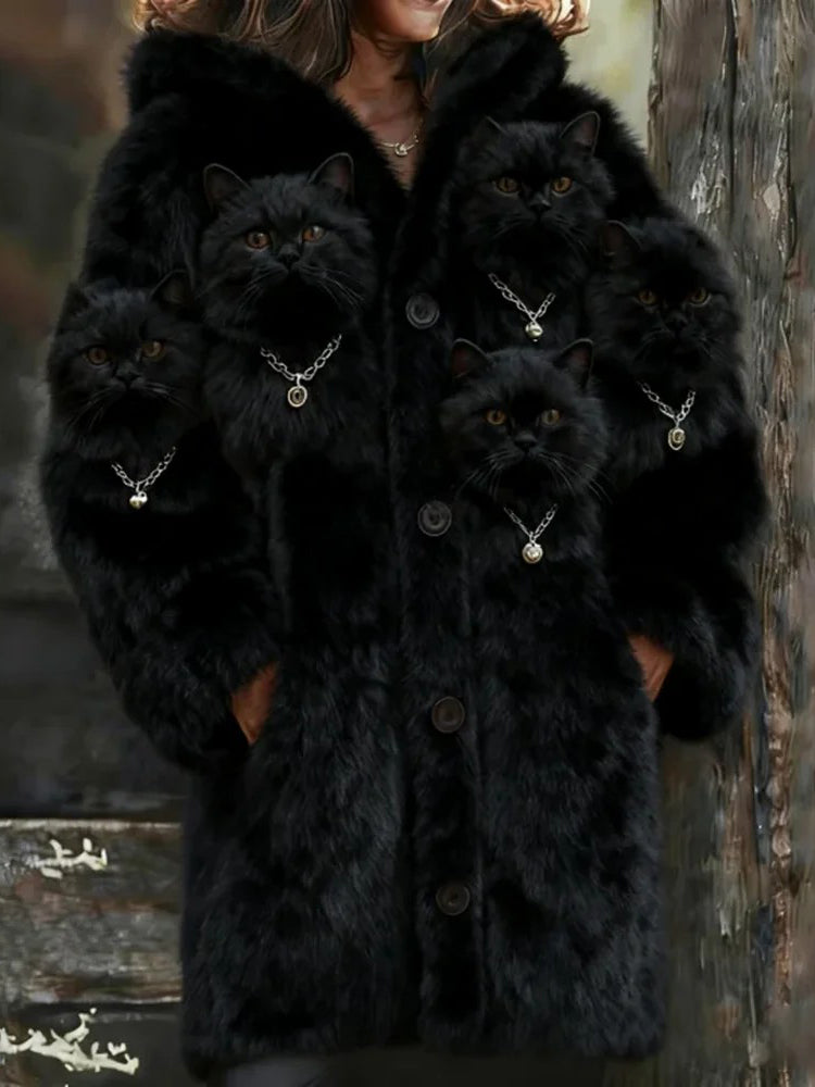 Női állat macska nyomtatás flanel meleg kabát
