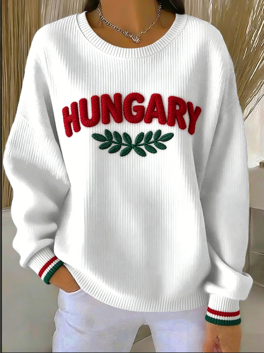 Női stílusos fehér "magyarország" hímzett bordás pulóver