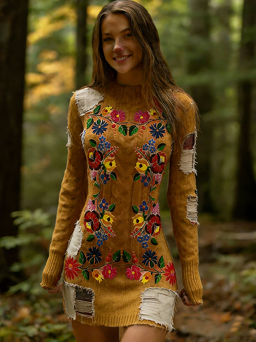 Női vintage etnikai stílus virágos nyomtatás kötött kényelmes és elegáns ruha