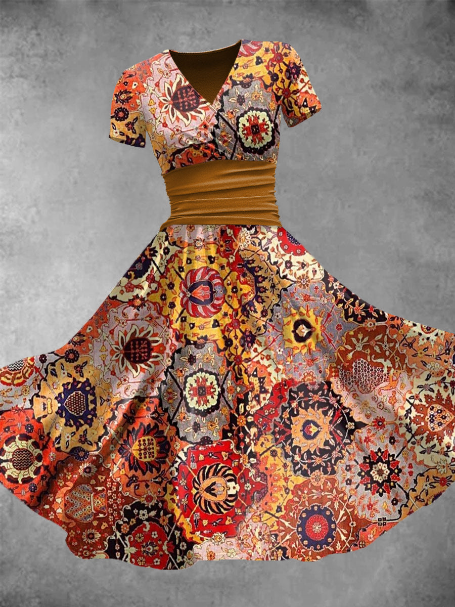 Retro etnikai stílus színes kockás nyomtatás v-nyak rövid ujjú midi ruha