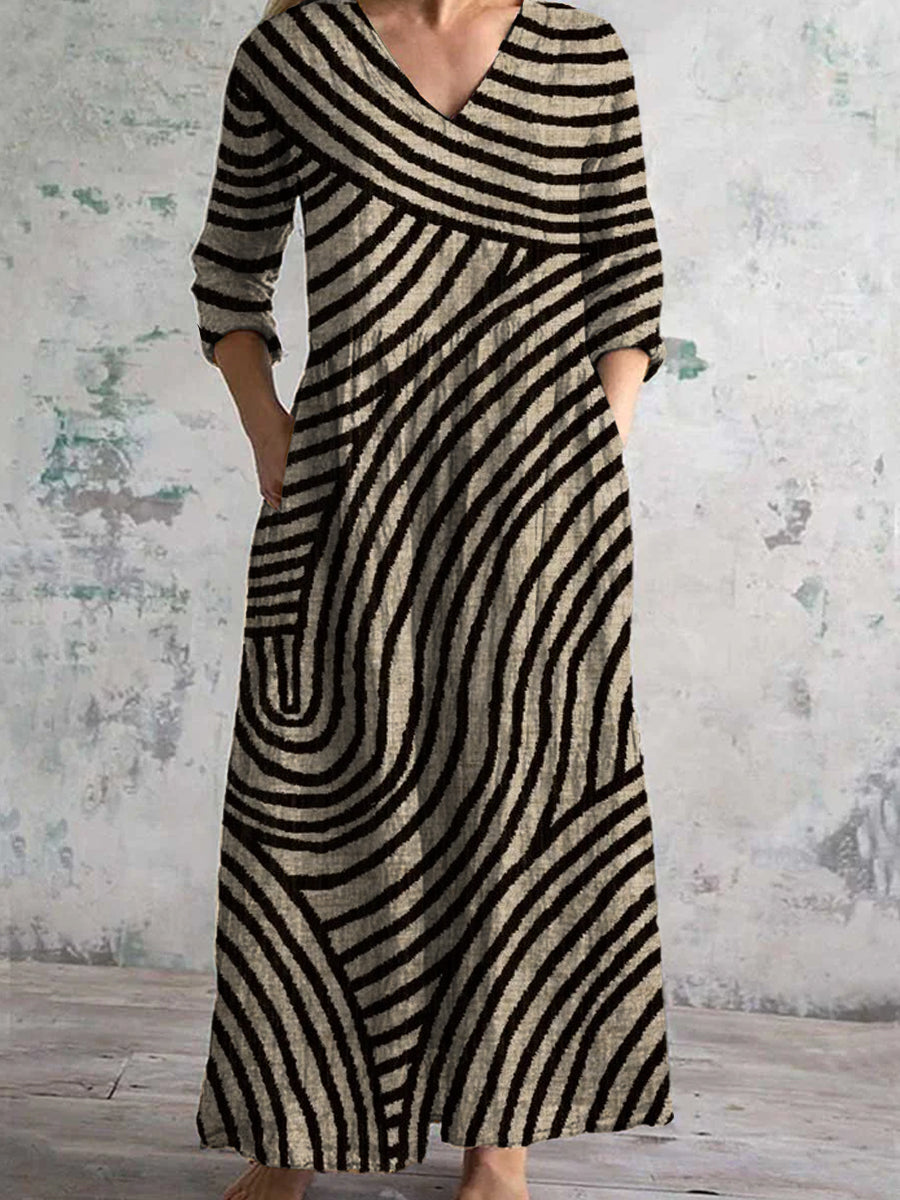 Vintage art print chic v nyak három negyed ujjú elegáns midi ruha