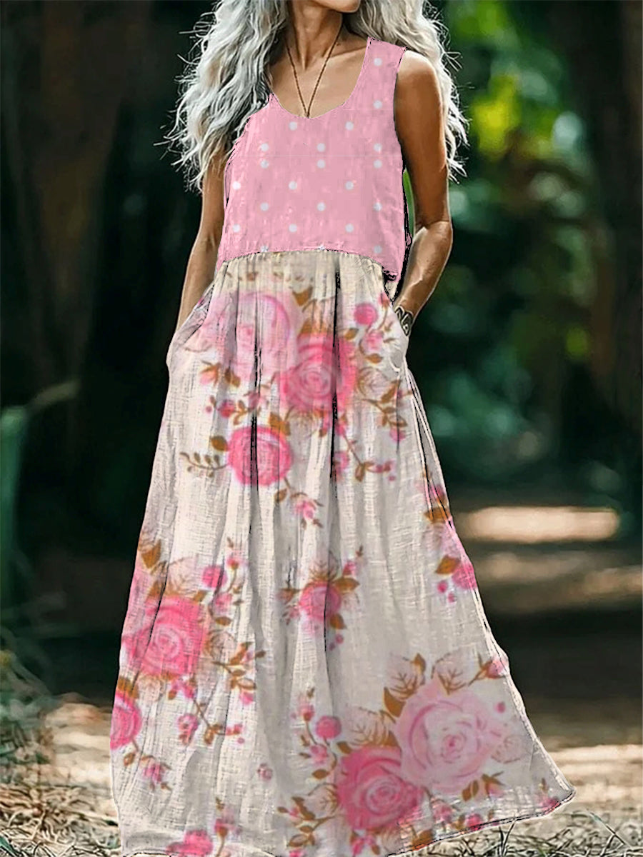 Vintage bohém virágos nyomtatás ujjatlan laza midi ruha